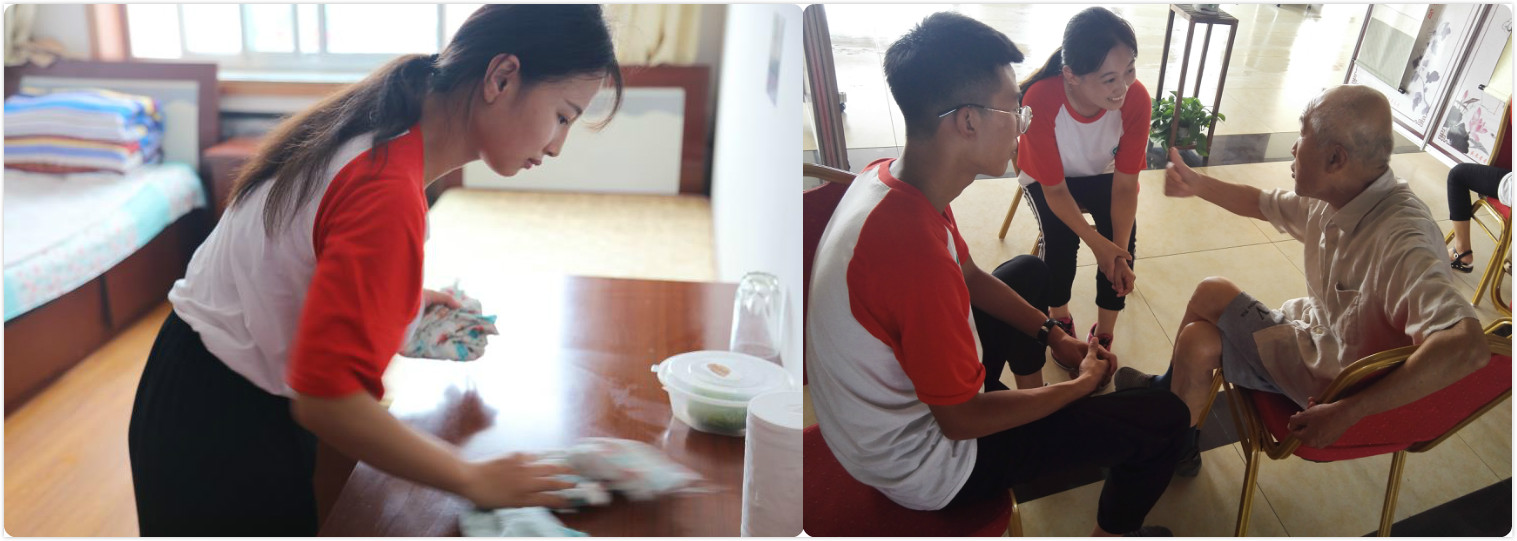 本次短期专业实习与大学生暑期社会实践,以短期专业实习为主,穿插配合暑期社会实践活动,最大限度地利用好零距离接触企业的每一分钟。短期专业实习内容主要包括养老公寓与智慧养老项目参观、老年大学活动体验、老年公寓“一带一”护理顶岗实习、养老标准化培训以及医养结合专题座谈等。暑期社会实践的主要内容是,在专业老师指导下,以专业为依托,开展养老机构服务人员队伍建设现状调查、“阳光半小时”失能老人服务、养老机构老年人生活适应状况研究等调研及服务。