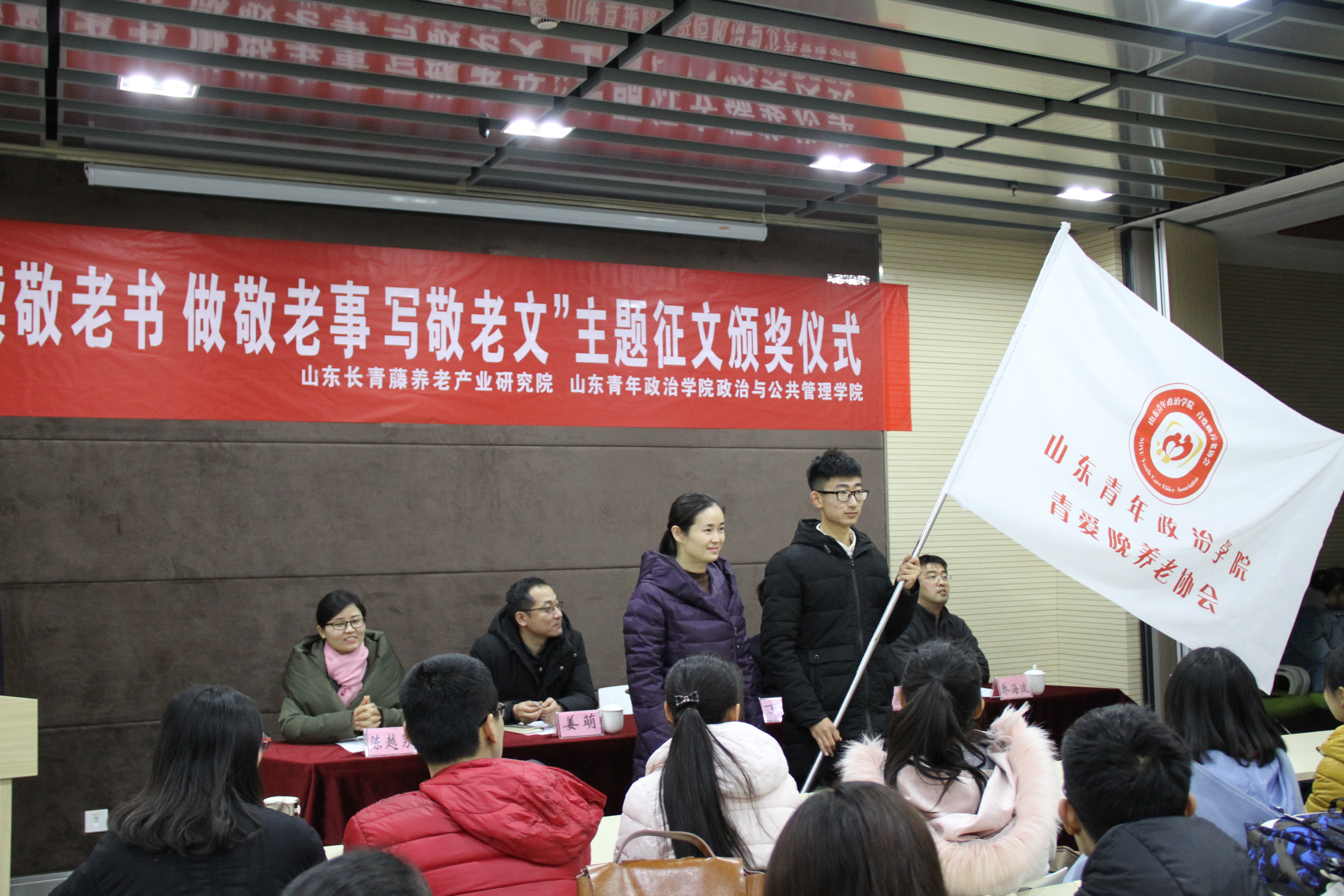 1月10日,为弘扬敬老文化,传承孝亲敬老传统,我校“读敬老书 做敬老事 写敬老文”主题征文颁奖仪式在众创基地会议室举办。政管学院党总支副书记丁萍、山东长青藤养老产业研究院副院长姜萌、老年服务与管理专业教研室主任尹洪禄、政管学院团总支书记乔海波、青爱晚养老协会指导教师陈越男及征文获奖学生共同参加了此次活动。