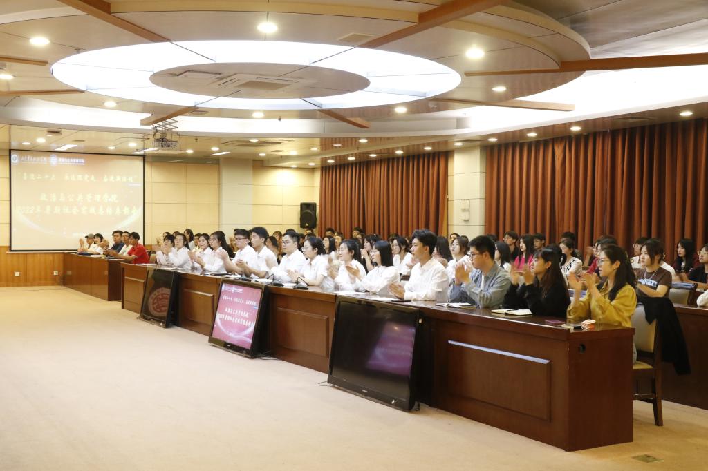 为迎接党的二十大胜利召开,引领广大青年学子明确政治站位、坚定理想信念、提升专业素养,将思想政治教育融入到社会实践中,9月27日下午,政治与公共管理学院在图书馆学术会议厅召开“喜迎二十大,永远跟党走,奋进新征程”2022暑期社会实践总结表彰会,学校团委书记孟祥佳、政治与公共管理学院党委副书记王正坤,学院全体辅导员、专业指导教师代表,暑期社会实践团队代表及2022级新生代表参加活动。