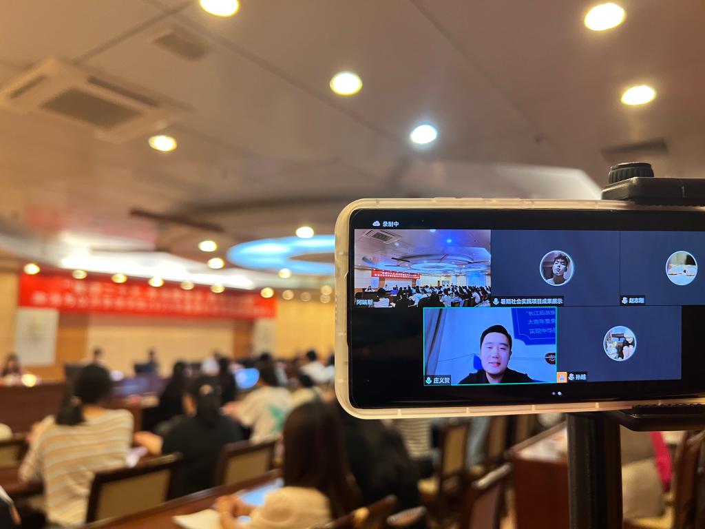 云端对话,共享实践成果。会议现场连线了校外暑期社会实践指导老师山东省大舜文化研究会副秘书长赵志刚、沂南县张庄镇团委书记庄义贺、东营市红荆吕剧艺术团团长张海霞,老师们对所负责团队的社会实践开展情况进行了细致的点评与反馈,充分肯定了同学们在实践中表现出的吃苦耐劳、脚踏实地的奉献精神,鼓励同学们要充分利用自已的专业优势和知识资源丰富自身的社会实践经历,积极转化实践成果,真正提升社会实践的影响力。